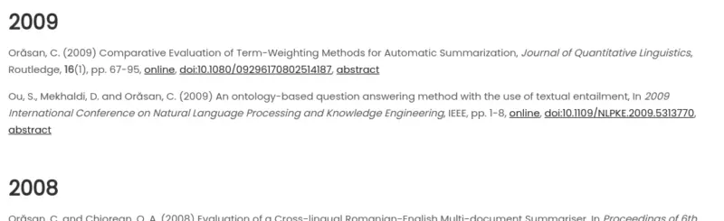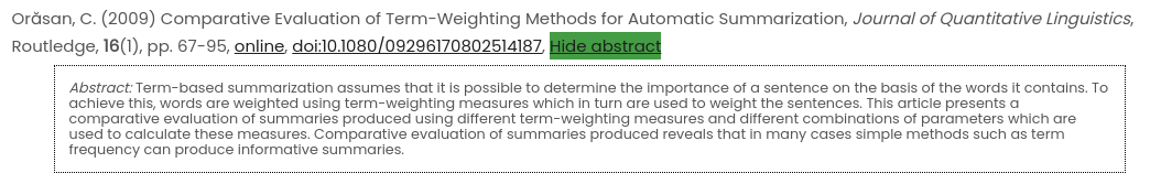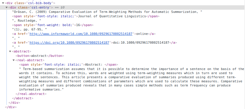 The aim here is to have a tag called <abstract> which wraps the text of the abstract. In addition, I also added a button to display the abstract because I do not want to have it displayed all the time. The resulting HTML for an entry looks like this: